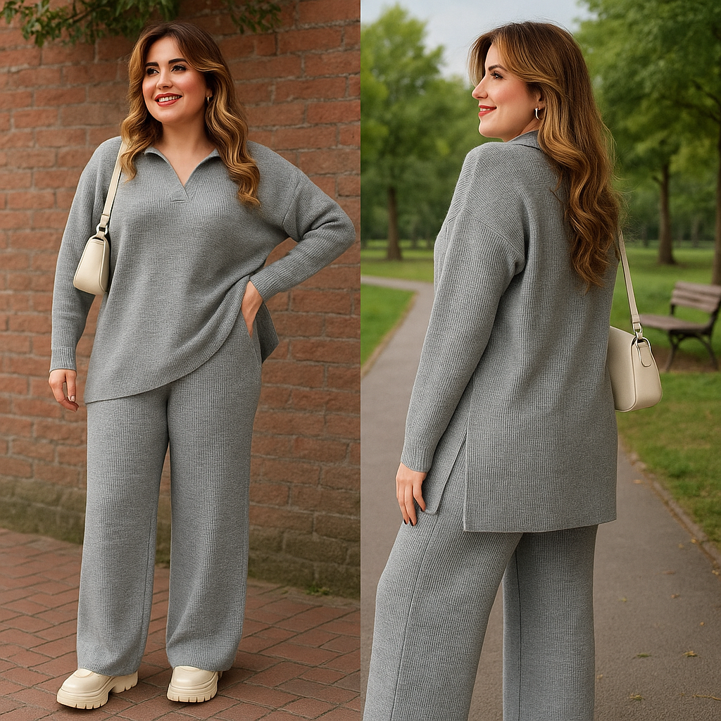 Questo completo in maglia, composto da maglione a maniche lunghe e pantaloni larghi coordinati, offre un equilibrio perfetto tra comfort e stile. Realizzato in tessuto morbido a costine, presenta un taglio rilassato, spacchetti laterali e un’elegante scollatura a V con colletto. Ideale per un look casual e raffinato, perfetto per il tempo libero o per sentirsi comode senza rinunciare allo stile.